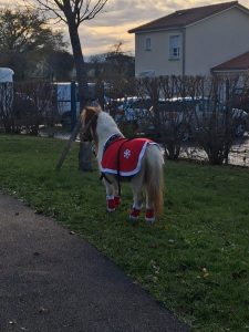 : petit parcours en main avec les chevaux miniatures et balade à poney pour les enfants et visite improvisée à l’intérieur pour les résidents