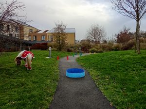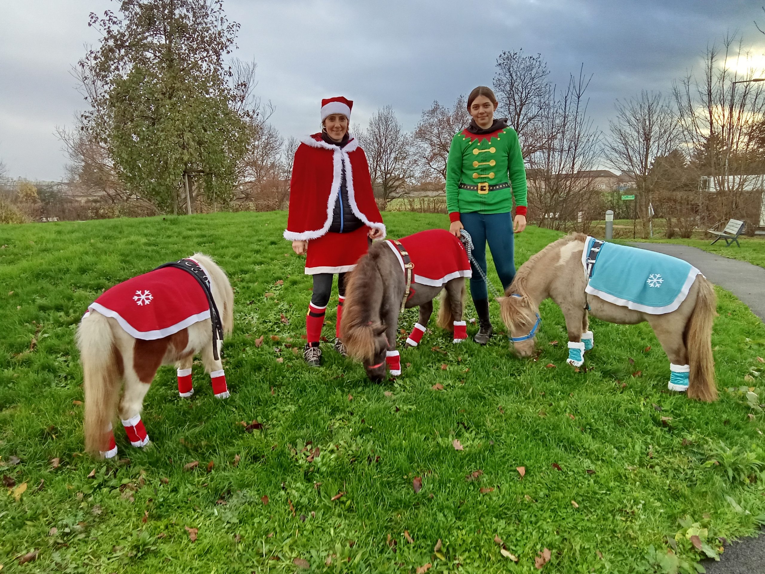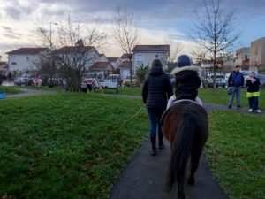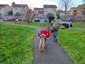 : petit parcours en main avec les chevaux miniatures et balade à poney pour les enfants et visite improvisée à l’intérieur pour les résidents